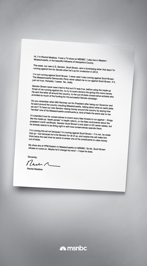Maddow, who lives in western Massachusetts, called Brown a “creep” in a planned MSNBC newspaper ad scheduled to run today and slammed him for sending out a nationwide fund-raising letter this week “smearing me to raise money for himself.”