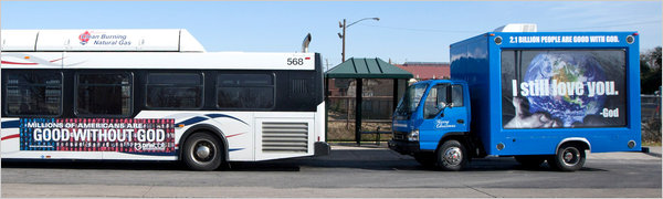 A public bus rolls by with an atheist message on its side: “Millions of people are good without God.” Seconds later, a van follows bearing a riposte: “I still love you. — God,” with another line that says, “2.1 billion Christians are good with God.”