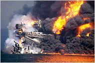 Equally vivid are the photographs of the burning rig “provided to the New York Times by a worker on a nearby boat who asked not to be identified.”
