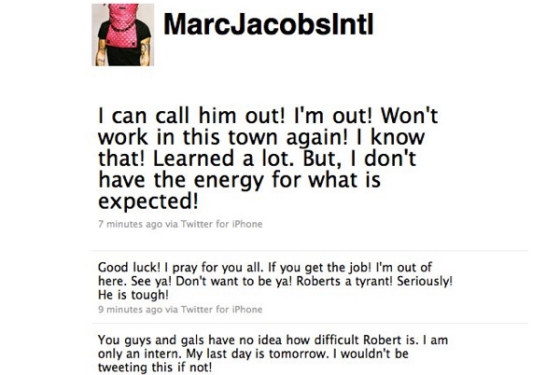 On Friday at around midnight the tweets you see here were posted to the Marc Jacobs Twitter feed@MarcJacobsIntl. Apparently company CEO Robert Duffy had an “unnamed intern,” according to the Daily Mail, take over the feed while he searched for a dedicated Twitterer to hire. Among the complaints posted to the feed was that Duffy hadn’t been satisfied with any of the 50 candidates presented to him for the position — and that spelling was a real burden.