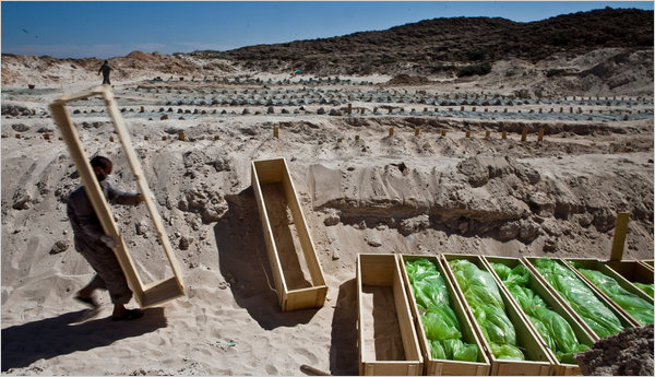 The corpses of the soldiers of Col.Muammar el-Qaddafi, wrapped in cloth or plastic sheets, had arrived in trucks. The men who would bury them sprinkled perfumed powder on the dead men’s burned or bloodied brows. Then they prayed. A quiet processional began.