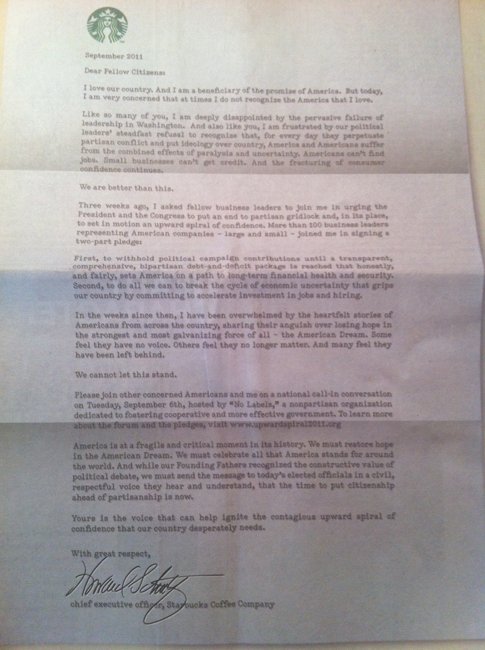 The big irony is that Schultz is saying to his fellow power-wielders to withhold campaign donations — but he says so via a paid advertisement that is meant to influence the political process, i.e., an election expense made all the more legal by Citizens United. A political expenditure (advertisement) telling other people not to make political expenditures (campaign donations). A farce.