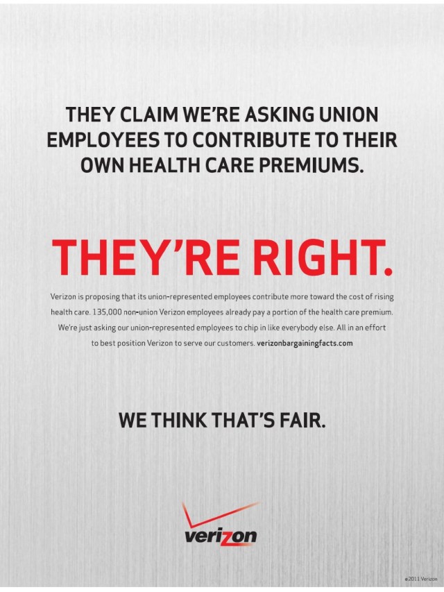 Verizon is once again running full-page ads in the Boston Globe painting the telecom giant’s union employees as unreasonable in their negotiating demands: