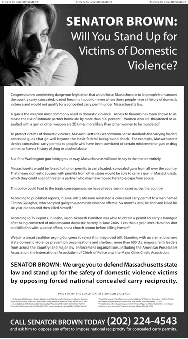 [T]he Coalition to Stop Gun Violence placed a full-page ad in the Boston Globe on Wednesday, urging Sen. Scott Brown (R-Mass.) to oppose any bill that would achieve nationwide concealed carry reciprocity among states.