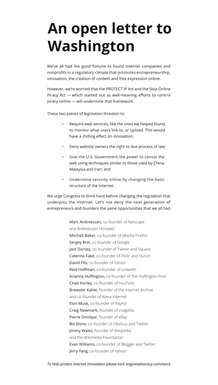 Wednesday’s New York Times and Wall Street Journal featured this full-page ad opposing the PROTECT IP Act and Stop Online Piracy Act currently being considered by Congress.