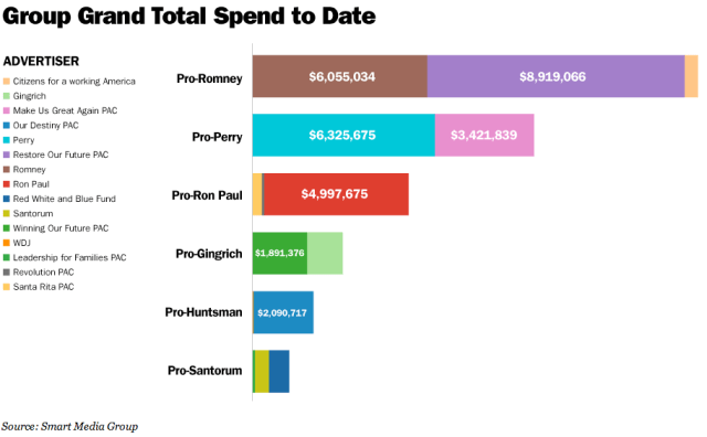 You can’t spit without hitting a Super PAC in the GOP presidential primary, as this helpful chart from Time graphically illustrates (through 1/12/12).