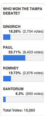 The first 35 minutes of the debate were the best of the season, hands down. Brian Williams pushed Romney and Gingrich into each other a few times, and then they managed to moderate the debate all by themselves. And Williams admirably let them. They attacked and defended back-and-forth–but did so respectfully, letting each other give complete answers without interrupting or name-calling. Amazingly civil, even with their aggressive accusations and questioning of each other. Too bad the following hour was such a yawner.