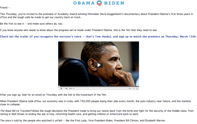 Because we’re all about you splendid readers, the hardworking staff signed up for a preview of Barack Obama’s hagiographic video The Road We’ve Traveled, scheduled to be released this week.