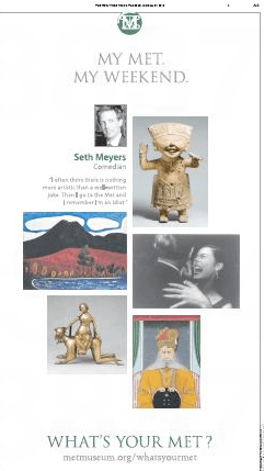 The Metropolitan Museum of Art has launched a new ad campaign with the theme, “MY MET. MY WEEKEND” that features celebrities from Hugh Jackman to Marc Jacobs highlighting their Met favorites (Village Voice Q&A with Met director Thomas Campbell here).