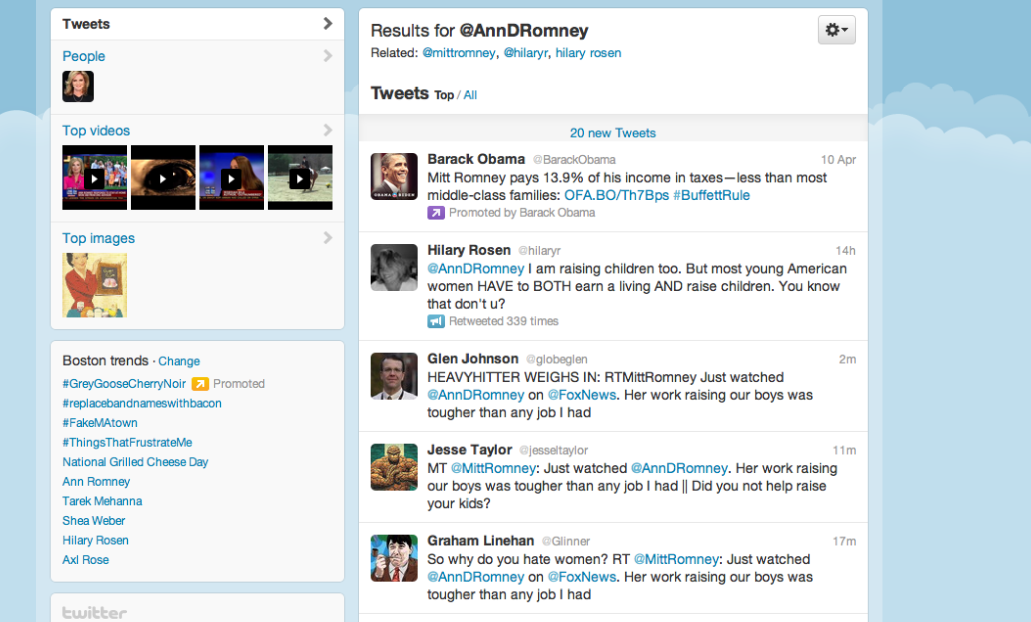 Earlier, though, Barak Obama owned @AnnDRomney – or rented it, anyway. When you plugged that Twitter handle into the search box, you got this: