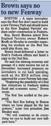 The clipping . . . comes from the January 9, 2001 Wilmington Morning Star. The story was written in the middle of the Red Sox desire to build a new stadium. Brown when asked, commented that Foxborough made sense, rather than duplicate public outlay. That’s what the story says.