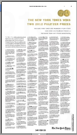 In a characteristic gesture of self-congratulation, Sunday’s New York Times ran a full-page ad saluting its 108 Pulitzer Prizes, including this year’s duo of Jeffrey Gettleman (International Reporting) and David Kocieniewski (Explanatory Reporting).