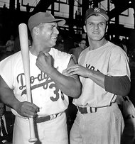 From the New York Times obit (shown in photo with the Los Angeles Dodgers’ Roy Camapanella):
