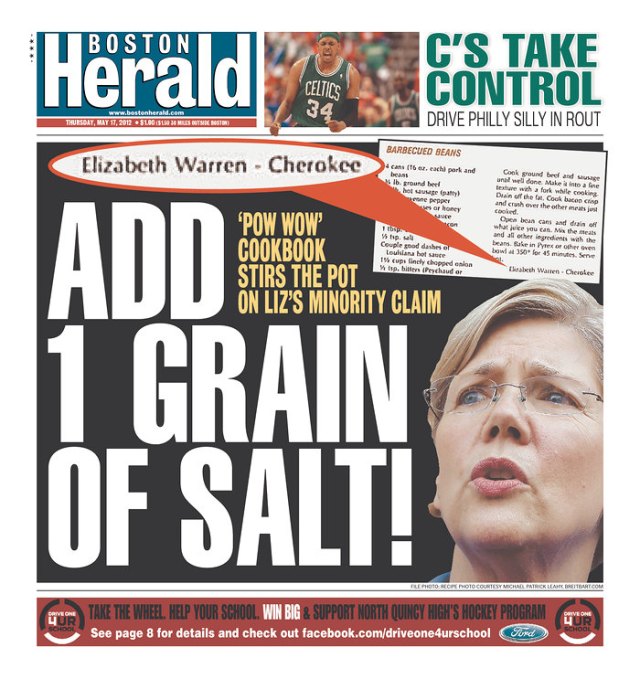 Is Herald trying to have it both ways? It’s attacking Elizabeth Warren for claiming Cherokee ancestry while also selling newspapers to people who may have claimed to be descended from Native Americans.