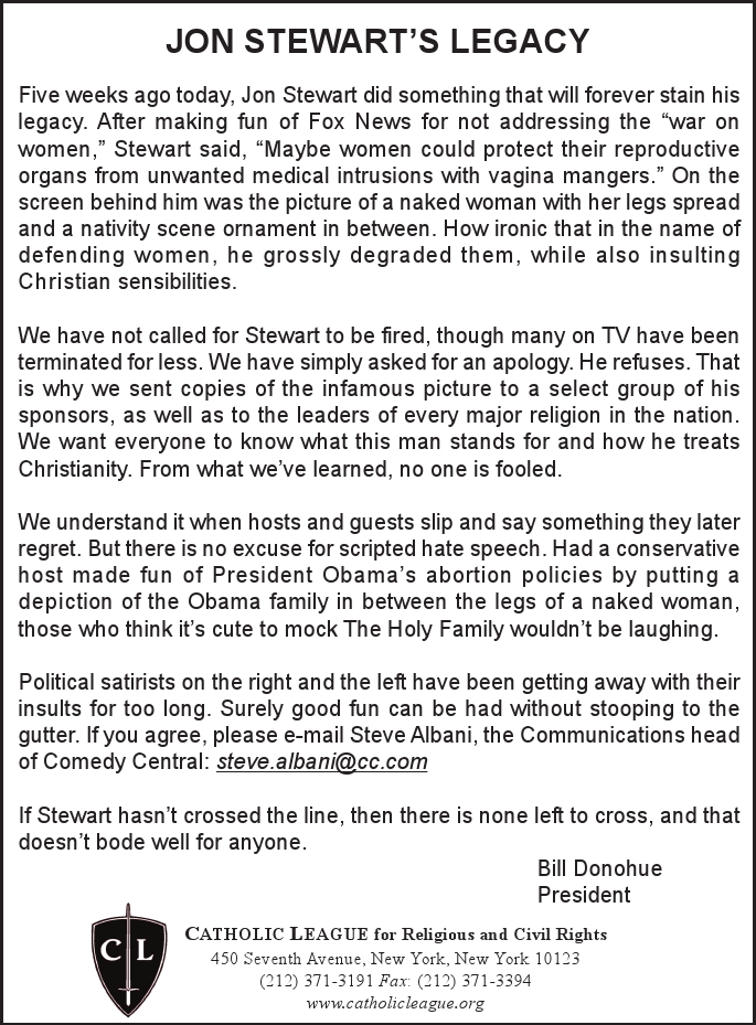Crazy Train engineer Bill Donohue of the Catholic League is on the adpath again, this time regarding a segment the recently ran on The Daily Show with Jon Stewart. This ad ran on the op-ed page of today’s New York Times: