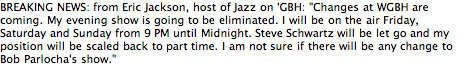 I have a theory. I think WGBH is trying to stop everyone from listening to the radio. Why else would they reduce Eric and eliminate Steve ? Instead of doing that, they should realize what a gold mine Eric and Steve are. What’s not to love?- DJ’s that are brilliantly playing the highest art form being made today, living in the same town where the program is being recorded so that the public learns about music events happening the programming creates a sense of community.