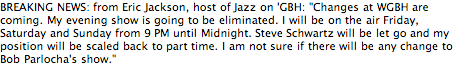 I’ll especially miss hearing Steve Schwarz. Without his show I never would have heard of Tony Fruscella or Don Joseph. I’m guessing that the braintrust at ‘GBH has figured out a way to run the audio portion of their infomercials on the radio.