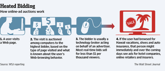 As the Journal piece points out, the online-advertising business now totals $31 billion – with a bullet. Which has led to online auctions “where advertisers buy data about users’ Web browsing. Krux estimated that such auctions, known as real-time bidding exchanges, contribute to 40% of online data collection.”