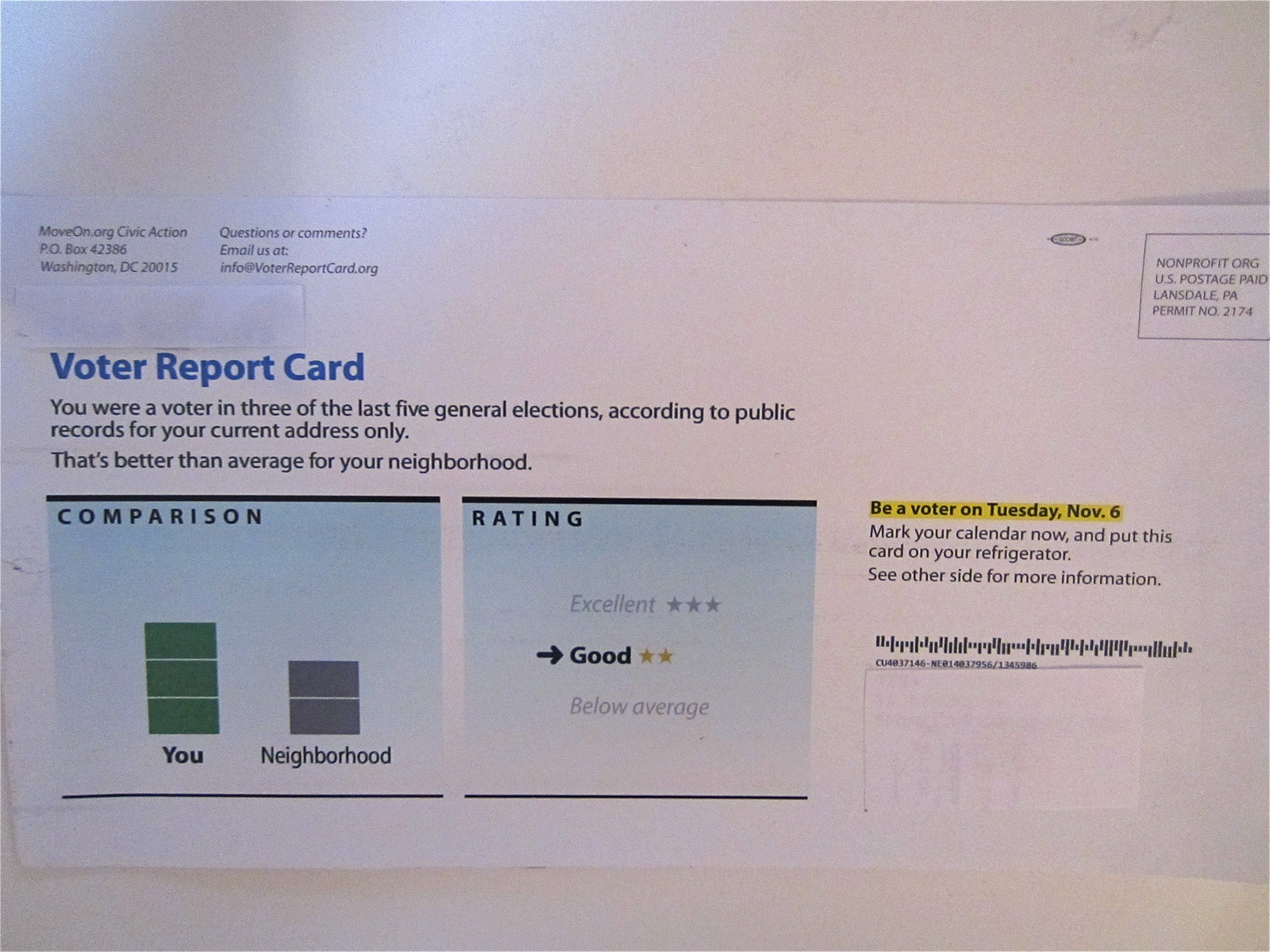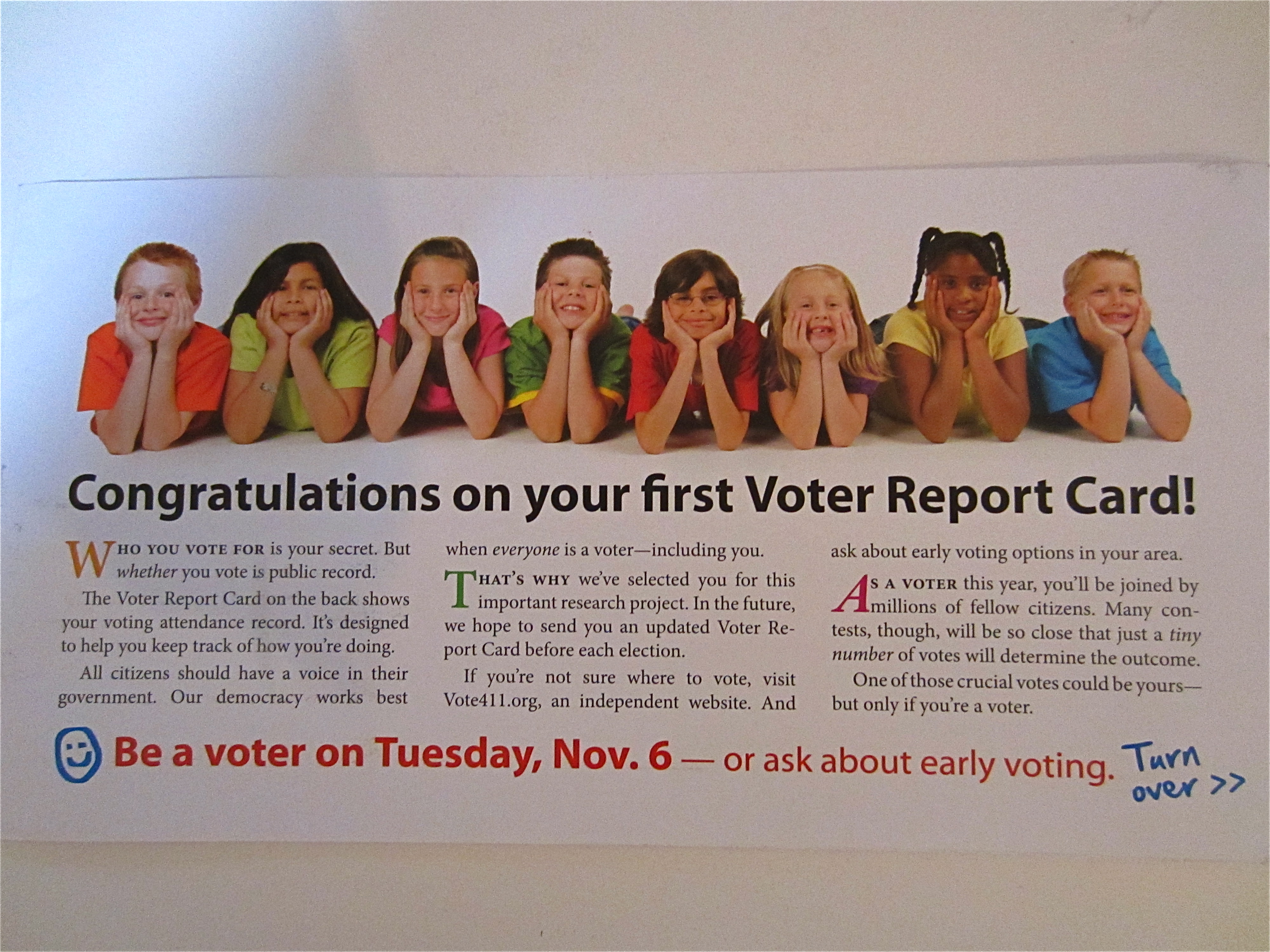 From Montana. My voter report card was mailed by the League of Conservation Voters. It got my voting record wrong. And it got me plenty steamed. I’ve voted in every general election starting in 1968. The tactic is described in Sasha Issenberg’s book, The Victory Lab. There’s going to be hell to pay.