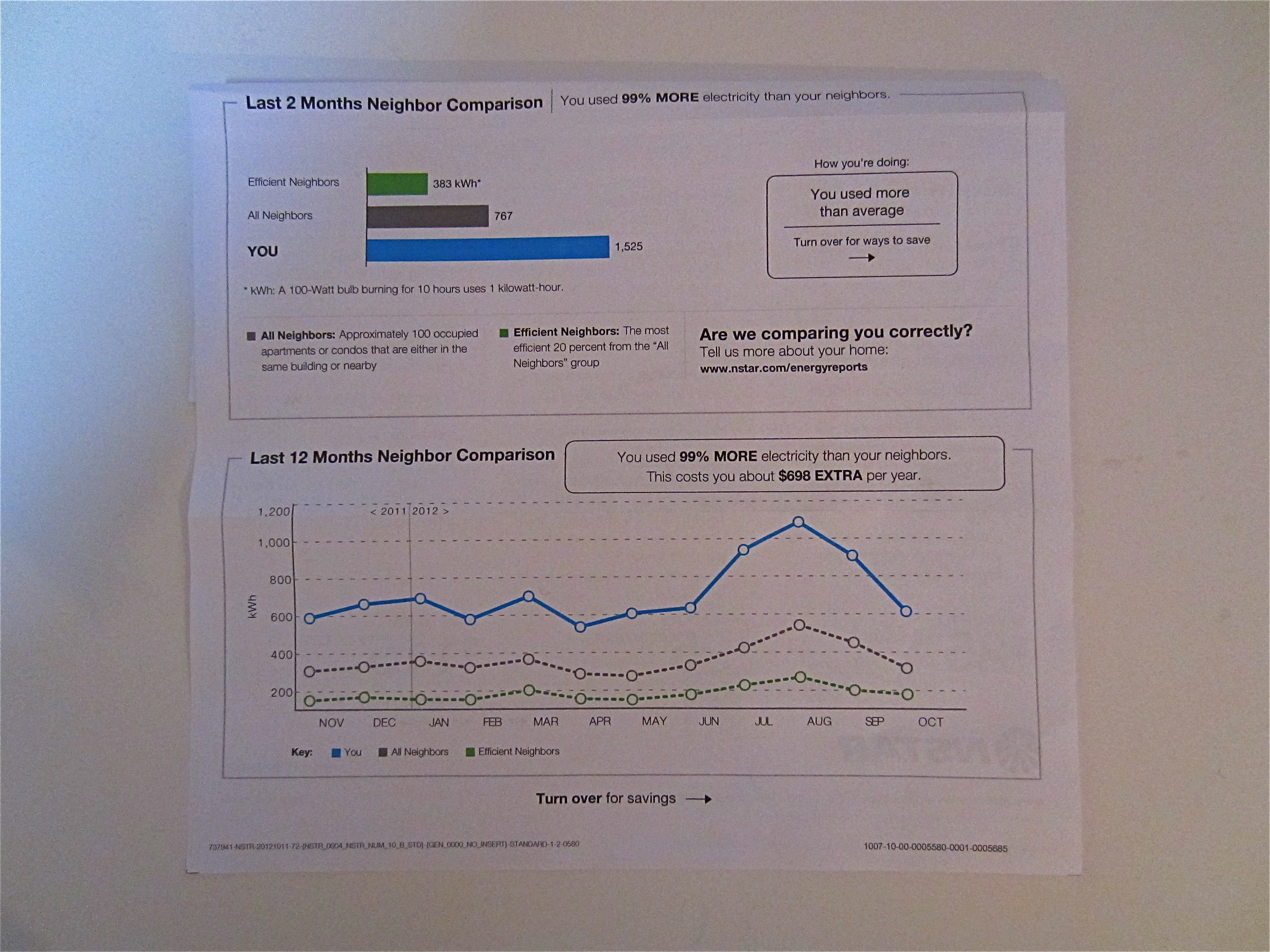 The NSTAR report is bogus. They want you to call and give them details THEN they can really give you your usage based on a similar house- not your neighbors at all. Call and OPT OUT of this. Talk about a waste of money. This is as wasteful as the healthcare company’s elaborate ads. Voting record stuff? Again- such a waste of money.Keeping up with the Jones’ doesn’t apply to voting.
