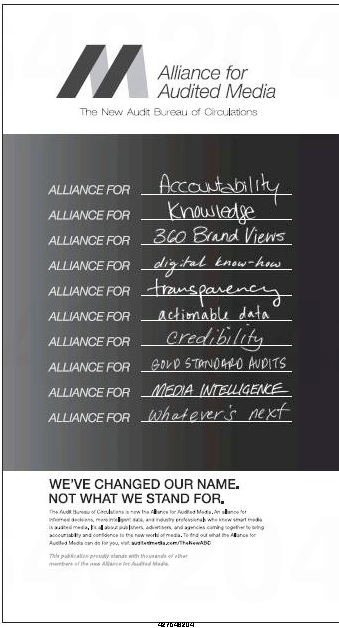 The Audit Bureau of Circulations — founded by advertisers, agencies and publishers in 1914 to ensure accuracy in the reporting of circulation figures — is becoming, effective immediately, the Alliance for Audited Media.