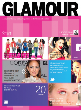The promotions, full pages attached to the covers of 14 titles from Allure to Wired, show the new Windows 8 Start screen tailored for most of the magazines’ top editors. Glamour, for example, depicts a Start screen for Editor-in-Chief Cindi Leive with items such as highlights from a magazine event, a tweet that Windows 8 pulled in from @glamourmag, a December Issue Sampler for Windows 8, the Windows camera app, a special edition of the magazine and a holiday-party reminder from the new Windows 8 Calendar app.