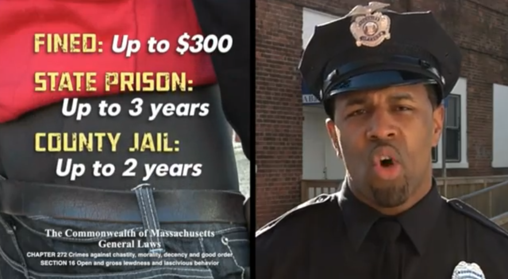 He proceeds to explain that in Massachusetts, wearing saggy pants could get you up a $300 fine, 3 years in state prison or 2 years in a county jail.
