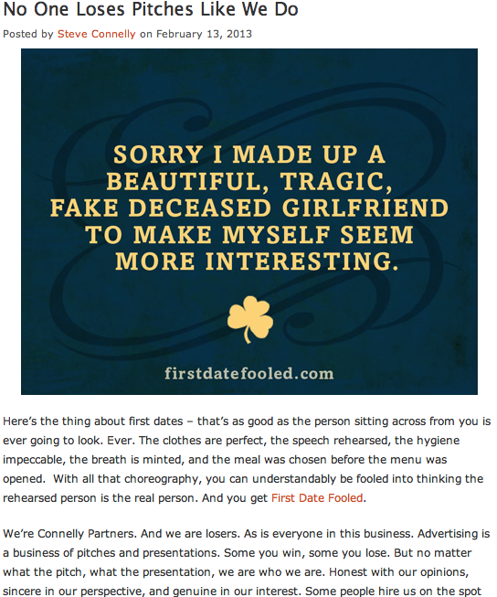 As someone that actually hires an advertising agency, as opposed to analyzing intent, I find the Connelly Ads refreshing. Not to lapse into social commentary but these are refreshingly self-deprecating, witty and non-traditional – coming at time when agencies are all too often lionized for churning out mindless drivel.