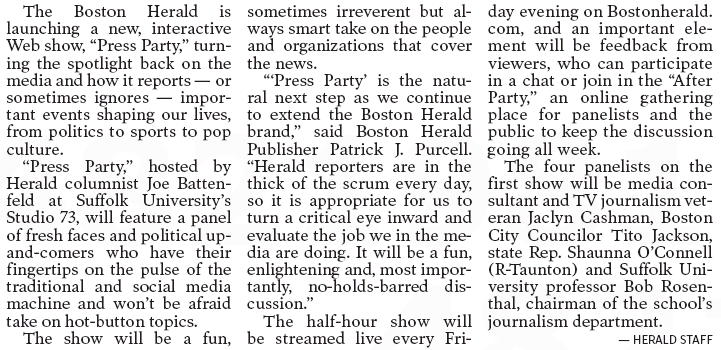 Our feisty local tabloid has increasingly increased its video production lately (Exhibit A: High Noon), and yesterday it upped the ante with the introduction of the Boston Herald Press Party on Page 2: