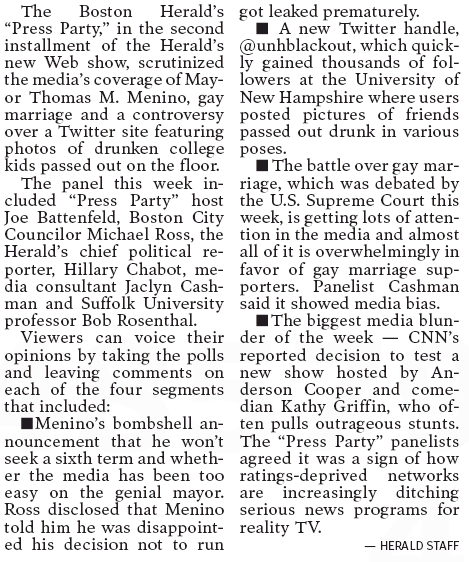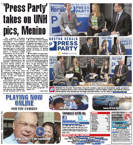 Start with the Underdog, the Boston Herald’s online Press Party. As always, our feisty local tabloid treats its every move as news. Page 2 news, to be exact: