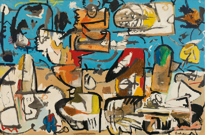 She sure took them, from the title composition (at right) to “the celebrated Mountains and Sea, of 1952; to key paintings of the later 1950s, among them The Museum of Modern Art’s Jacob’s Ladder (1957), and the UC Berkeley Art Museum’s expansive Before the Caves (1958). ” (View all here.)
