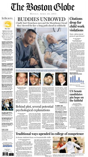 Monday’s Wall Street Journal and Boston Globe front pages featured his and her versions of the damage visited upon the Norden family by the Boston Marathon bombings.