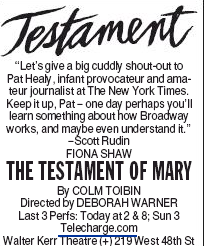An ad in TheNew York Times Saturday Arts section theater listings for The Testament of Mary states “Last 3 Perfs.” It also carries the following unusual quote from producer Scott Rudin: “Let’s give a big cuddly shout-out to Pat Healy, infant provocateur and amateur journalist at The New York Times. Keep it up, Pat — one day perhaps you’ll learn something about how Broadway works, and maybe even understand it.”
