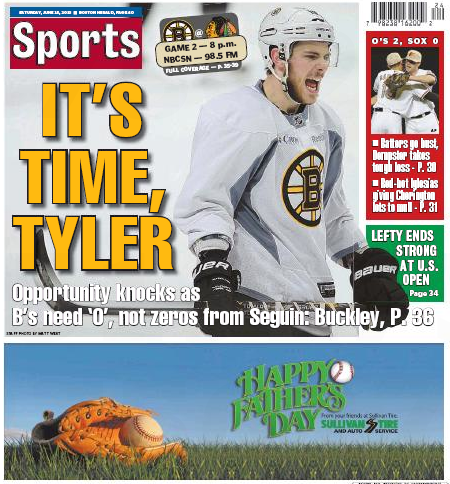 Assist to Tyler Seguin, who awoke Saturday morning to this Boston Herald back page: