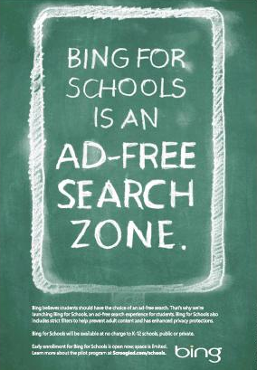 and private schools in the U.S. the choice to avoid the commercialization of student Web searches performed on the school network by removing all advertisements from search results. Bing is the first and only major search engine to give schools such a choice.
