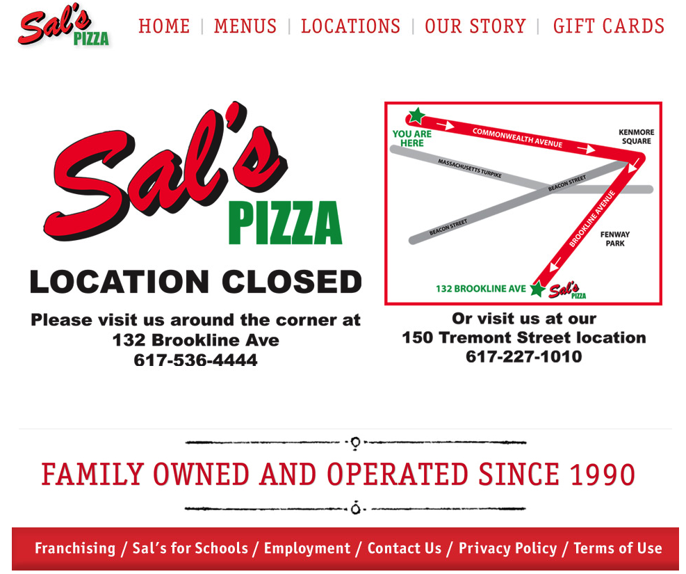 According to a post on Twitter from @sportsgirlkat, Sal’s Pizza on Commonwealth Avenue by Boston University has shuttered, with a check on the Sal’s website confirming that it has indeed closed down (the site refers customers to shops on Brookline Avenue in the Fenway and Tremont Street in downtown Boston).