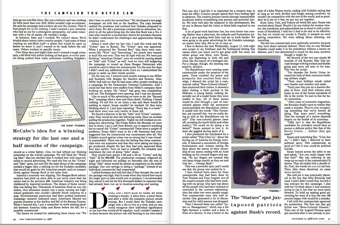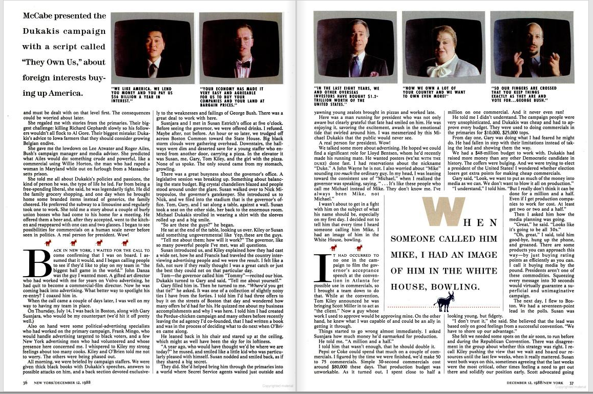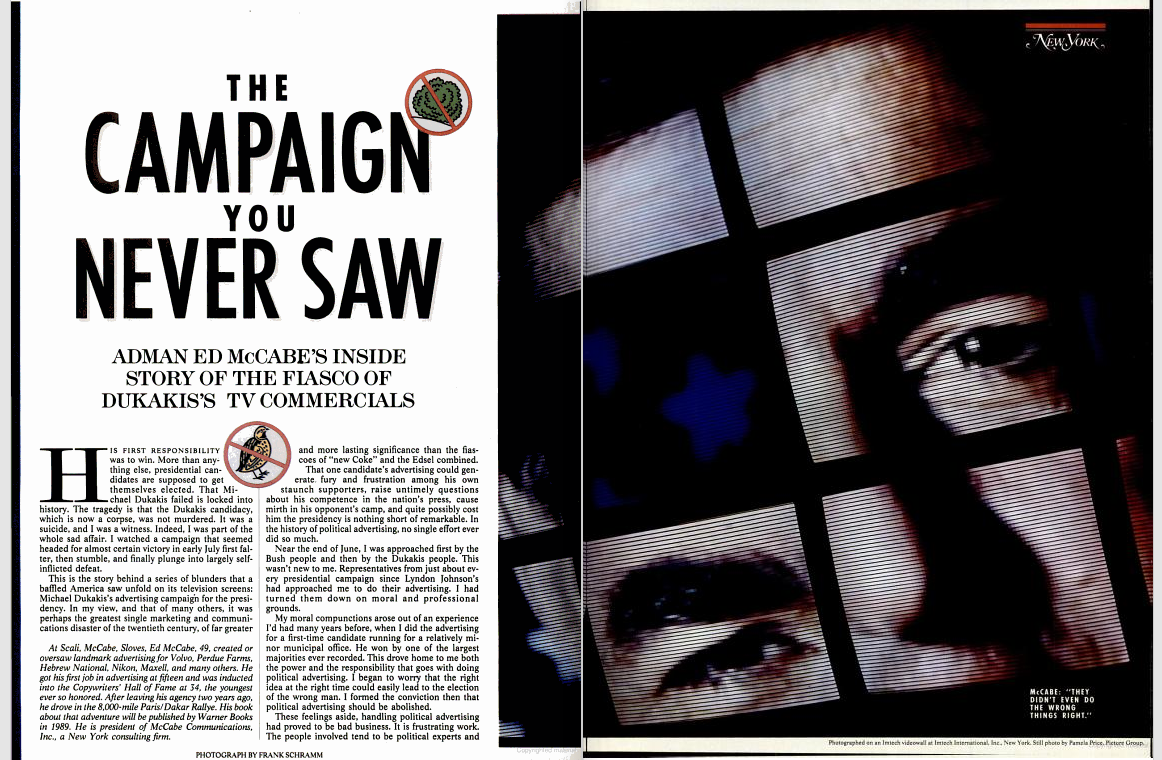 As we noted yesterday, the hardsearching staff has been trying to locate adman Ed McCabe’s legendary New York magazine takedown of the 1988 Michael Dukakis presidential ad campaign.