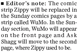Thanks for writing. Zippy will remain in our daily comics pages, just not Sunday. But it has been around for a long time, and like all our cartoon strips we are constantly evaluating new ones that come along that we think will keep those pages fresh. We think WuMo is a good example of that and over time readers will come to appreciate its humor. We, of course, know that all comic strips are subjective, and what one reader thinks is hilarious, another may not find funny at all. Every time we change a strip, we hear from some readers who are thrilled at the change and others who don’t understand it. But as with everything we do, we always appreciate our readers’ feedback and take it seriously.