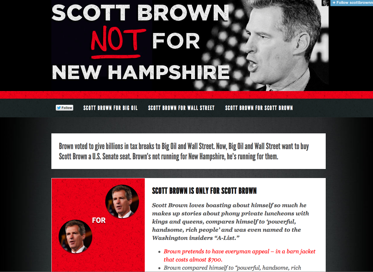 The New Hampshire Democratic Party, seizing on the fact that Scott Brown’s website is currently under construction, has created a fake website for him with all the reasons he wouldn’t be a good candidate: http://scottbrownnotfornh.com/