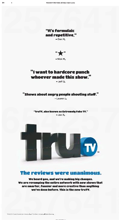 Rarely does an advertiser kick the crap out of itself in public (Dominos’ Our Pizza Sucks campaign in 2010 strikes us as the most recent example), but TruTV did just that in Monday’s New York Times.