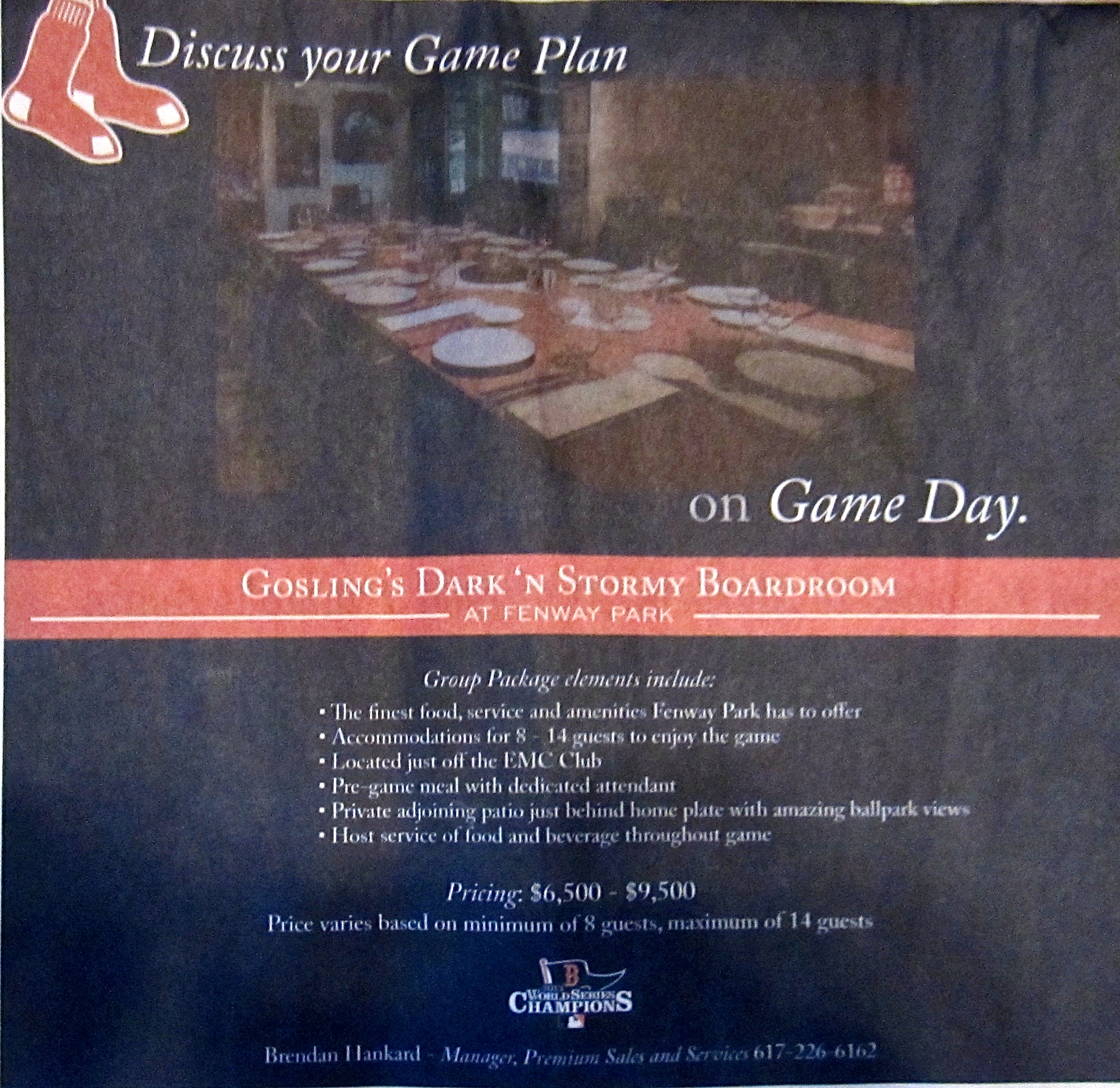 We’ll be calling Brendan Hankard – Manager, Premium Sales and Services – later today to discuss the finer points of pimping out Fenway Park.