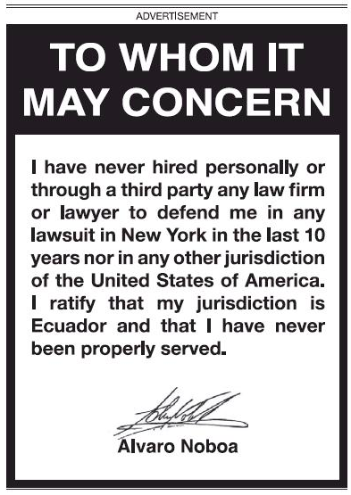 As the hardworking staff recently noted, some guy named Alvaro Noboa is involved in some kind of legal rumpus that has led him to run some lawyered-up ads in the New York Times.