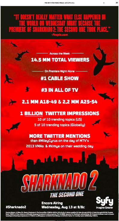 In the wake of the boffo debut of Sharknado 2 last week, SyFy ran this full-page ad in yesterday’s New York Times: