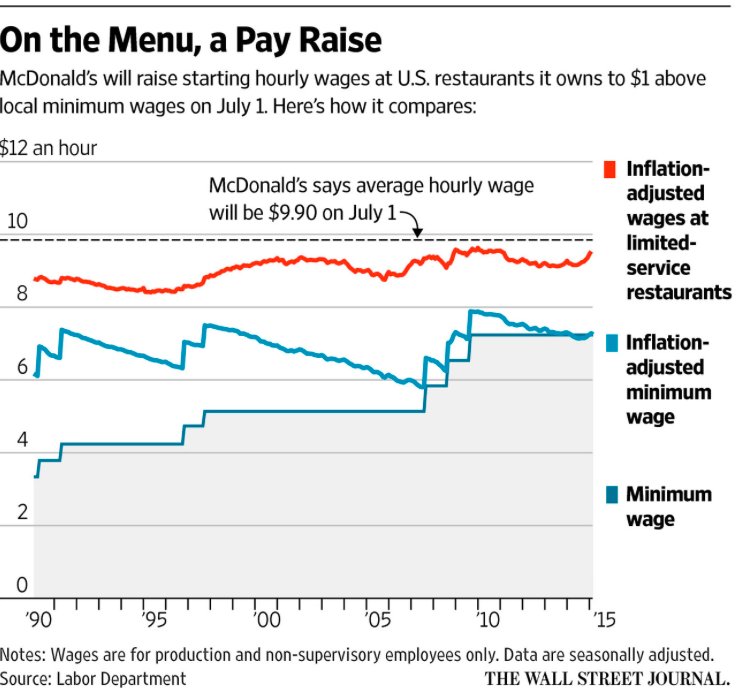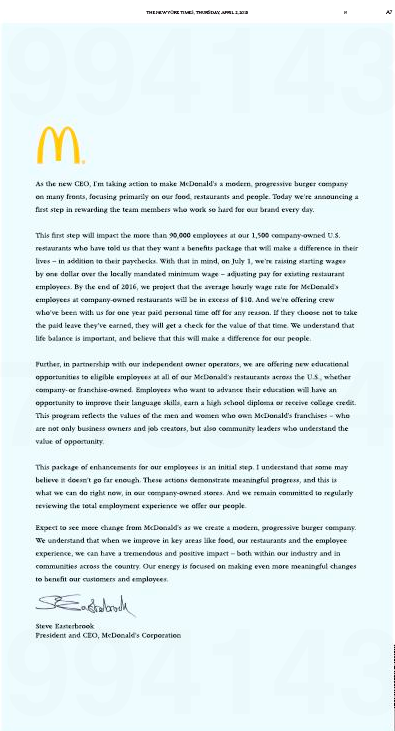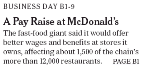 Crosstown at the Wall Street Journal, McDonald’s did not run an ad, but its pay hike got Page One coverage.