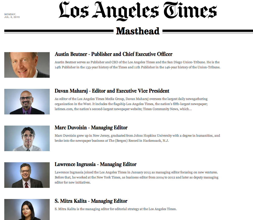 Except . . . that’s not the LA Times masthead. It’s the paper’s nameplate, or flag. The masthead, as the Glossary in the Newspaper Designer’s Handbook tells us, is “[a] block of information, including staff names and publication data, often printed on the editorial page.”