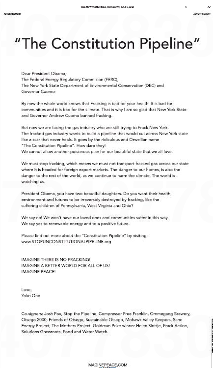 To be sure, the Yoko-industrial complex has inveighed against fracking before, specifically in a 2012 Times ad.
