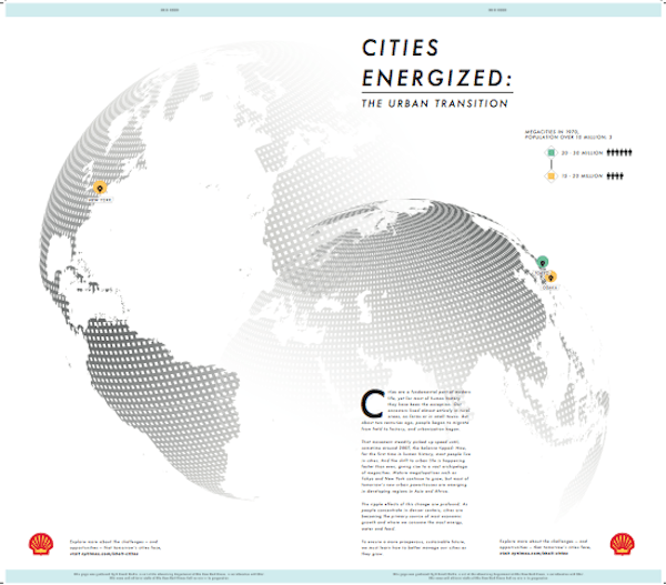 The ad, for Shell, is set to appear in print and online Wednesday, and it’s a far cry from the advertorials of days past. First, the size: The print component is an eight-page section that’s wrapped around home-delivered copies. (In the case of newsstand copies, the ad wraps the business section.) The top sheet is opaque vellum, for extra effect. The print creative extends the Web version, with infographics that show the urbanization of the world’s population. In what the Times called “icing on the cake,” the print ads are enhanced by augmented reality, so that people using the Blippar app can initiate a video by holding their phone over the page.
