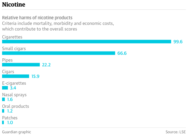 The health body concluded that, on “the best estimate so far”, e-cigarettes are about 95% less harmful than tobacco cigarettes and could one day be dispensed as a licensed medicine in an alternative to anti-smoking products such as patches.