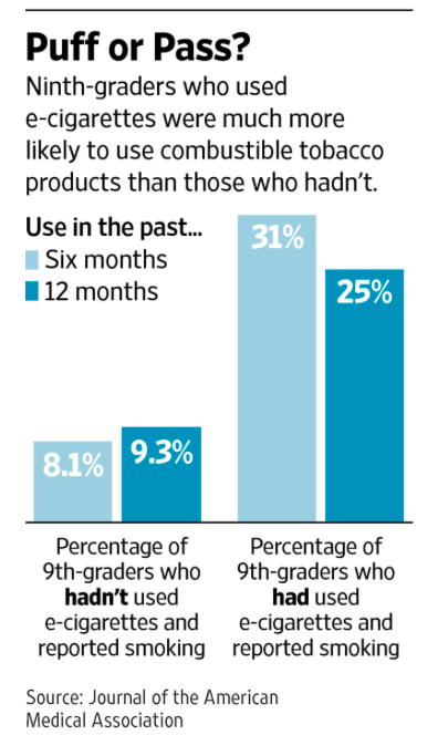 The study focused on ninth-graders at 10 public schools in Los Angeles who had tried e-cigarettes before the fall of 2013. Researchers surveyed those students in the spring of 2014 and fall of 2014, and discovered that they were about 2½ times as likely as their peers to have smoked traditional cigarettes, five times as likely to have smoked cigars, and three times as likely to have smoked hookahs.