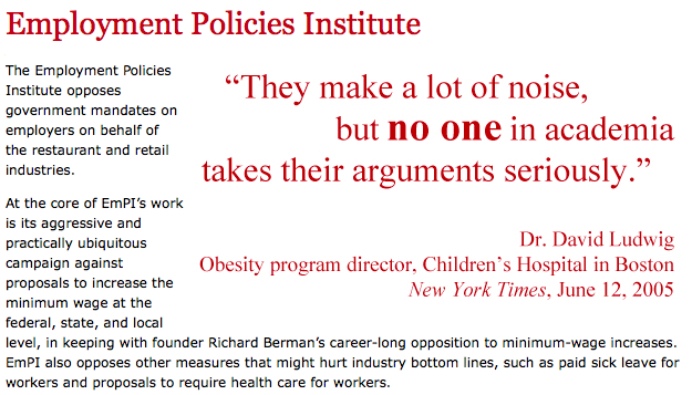 But here’s what leaves the hardworking staff feeling uneasy: The Employment Policies Institute is one of the many front groups orchestrated by Rick Berman (aka Dr. Evil in this 2007 60 Minutes takedown), the lobbyist lackey of untold corporations that have a vested interest in minimizing the minimum wage.